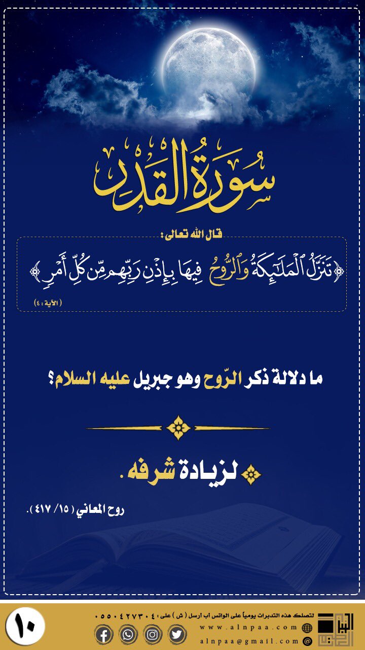 • التساؤل: ﴿تَنَزَّلُ الْمَلَائِكَةُ وَالرُّوحُ فِيهَا بِإِذْنِ رَبِّهِم مِّن كُلِّ أَمْرٍ﴾ ما دلالة ذكر الرّوح وهو جبريل عليه السلام؟