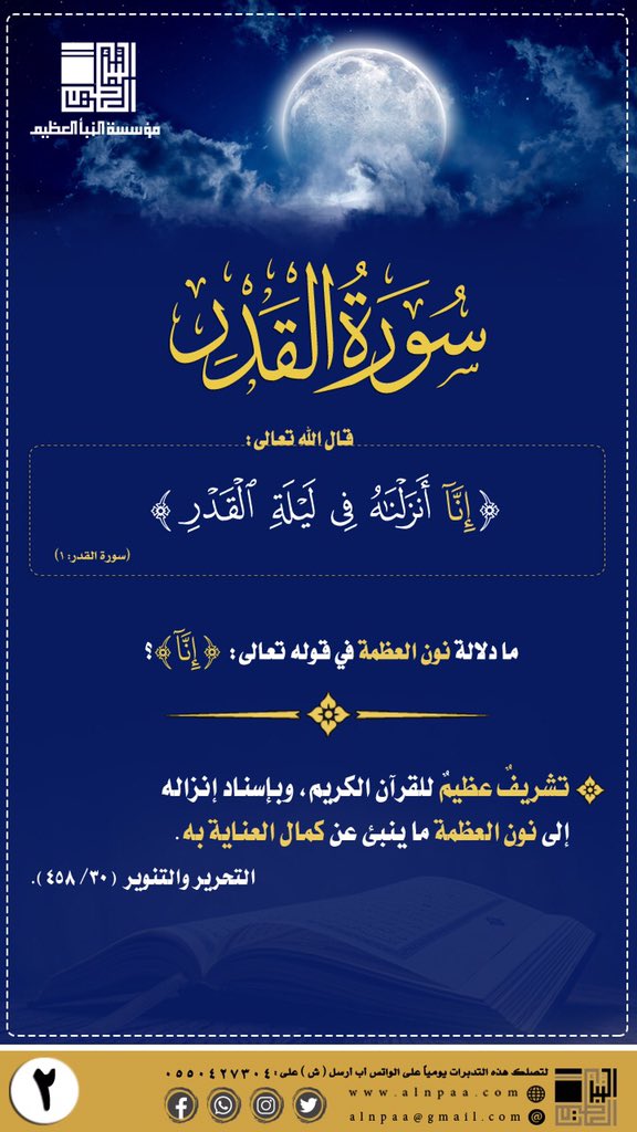 • التساؤل: ﴿إِنَّا أَنزَلْنَاهُ فِي لَيْلَةِ الْقَدْرِ﴾ ما دلالة نون العظمة في قوله تعالى: (إِنَّا)؟