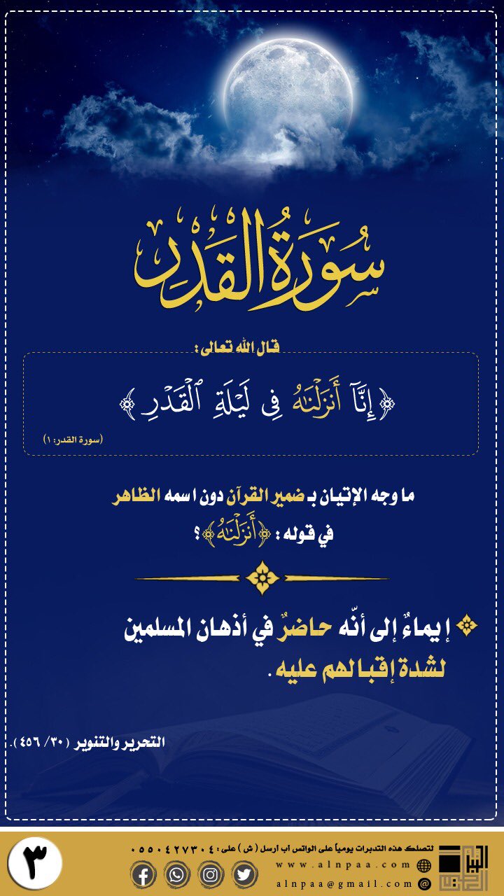 • التساؤل: ﴿إِنَّا أَنزَلْنَاهُ فِي لَيْلَةِ الْقَدْرِ﴾ ما وجه الإتيان بـ ضمير القرآن دون اسمه الظاهر في قوله: (أَنزَلْنَاهُ)؟