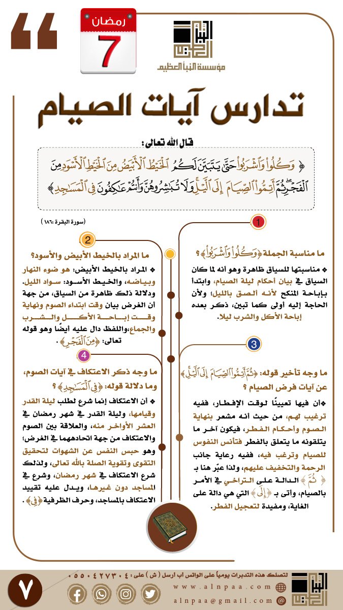 • إجابة التساؤل: المراد بالخيط الأبيض: هو ضوء النهار وبياضه والخيط الأسود سواد الليل. ودلالة ذلك ظاهرة من السياق، من جهة أن الغرض بيان وقت ابتداء الصوم ونهاية وقت إباحة الأكل والشرب والجماع، واللفظ دال عليه أيضًا وهو قوله تعالى: ﴿مِنَ الْفَجْرِ﴾.
