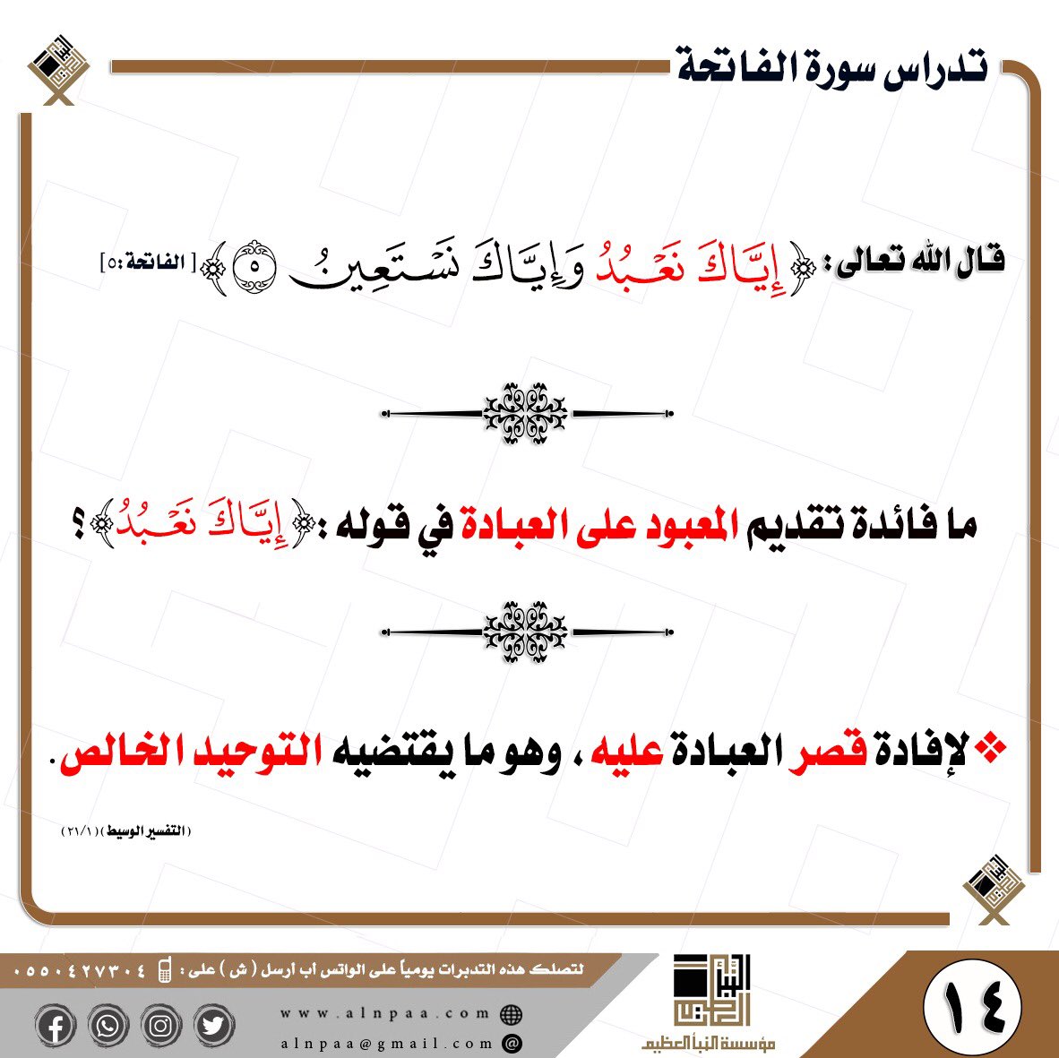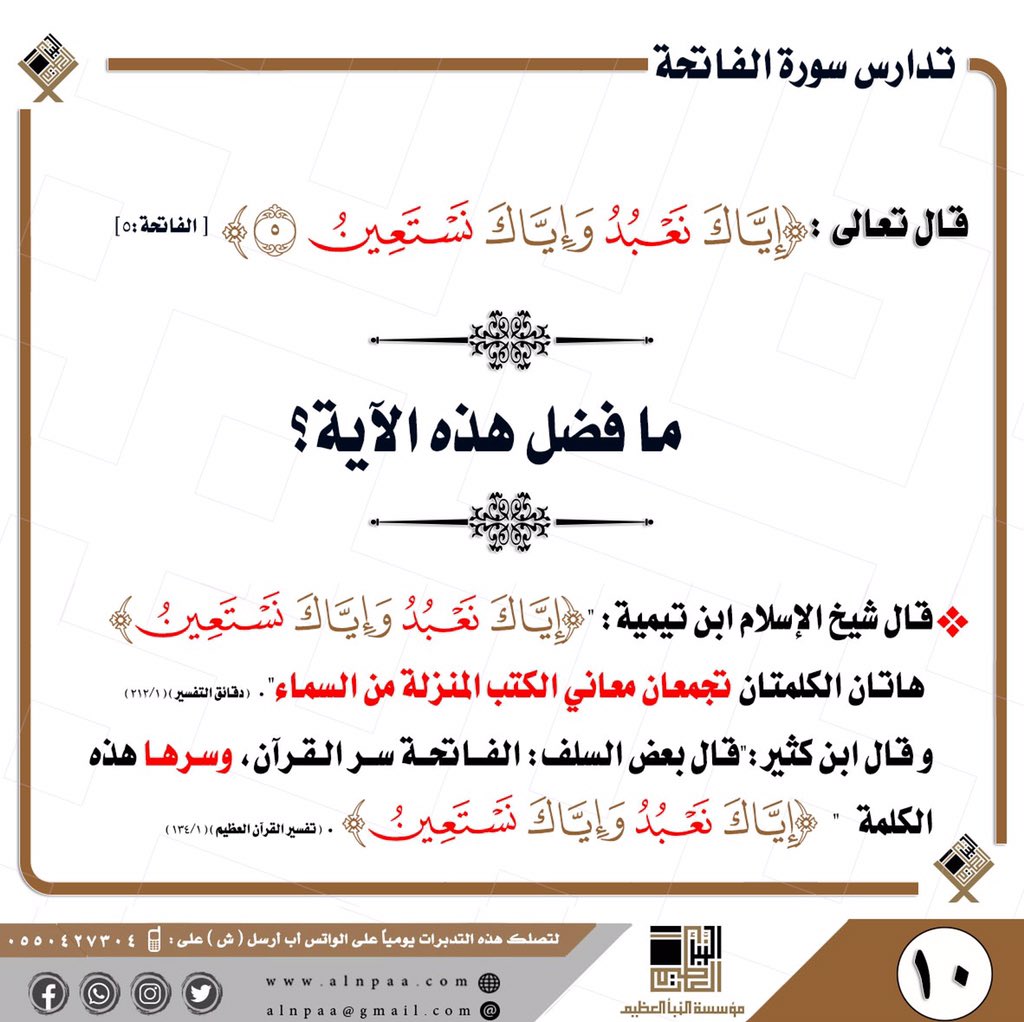 • التساؤل: قال تعالى: ﴿إِيَّاكَ نَعْبُدُ وَإِيَّاكَ نَسْتَعِينُ﴾ ما فضل هذه الآية؟