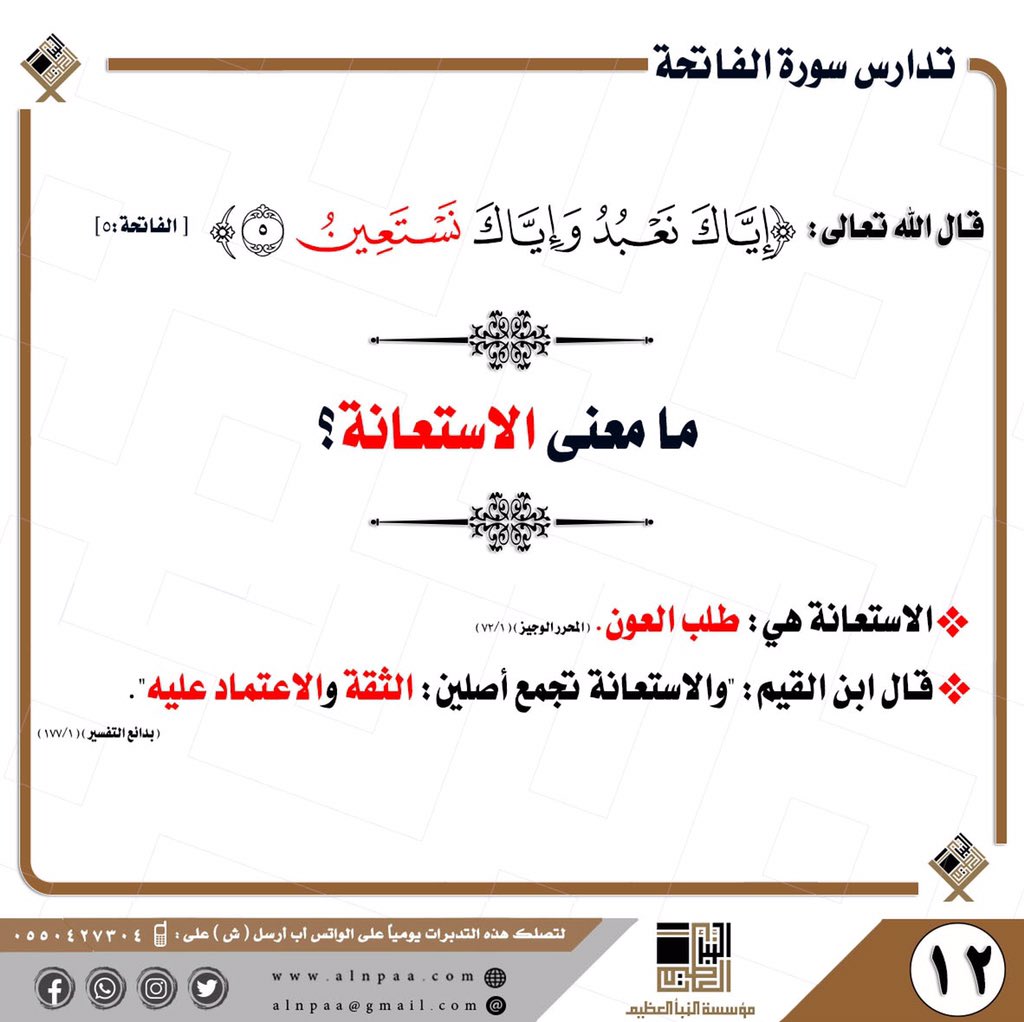 - قال ابن القيم: "والاستعانة تجمع أصلين: الثقة والاعتماد عليه". (بدائع التفسير؛ ١٧٧/١).