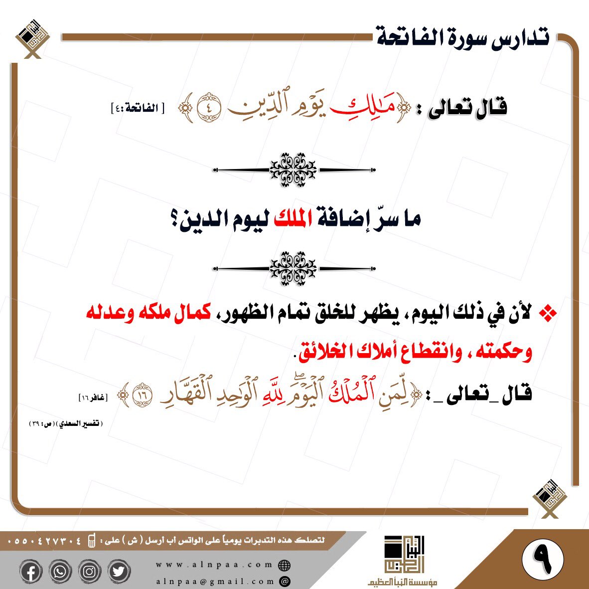 • التساؤل: قال تعالى: ﴿مَالِكِ يَوْمِ الدِّينِ﴾ ما سرّ إضافة الملك ليوم الدين؟
