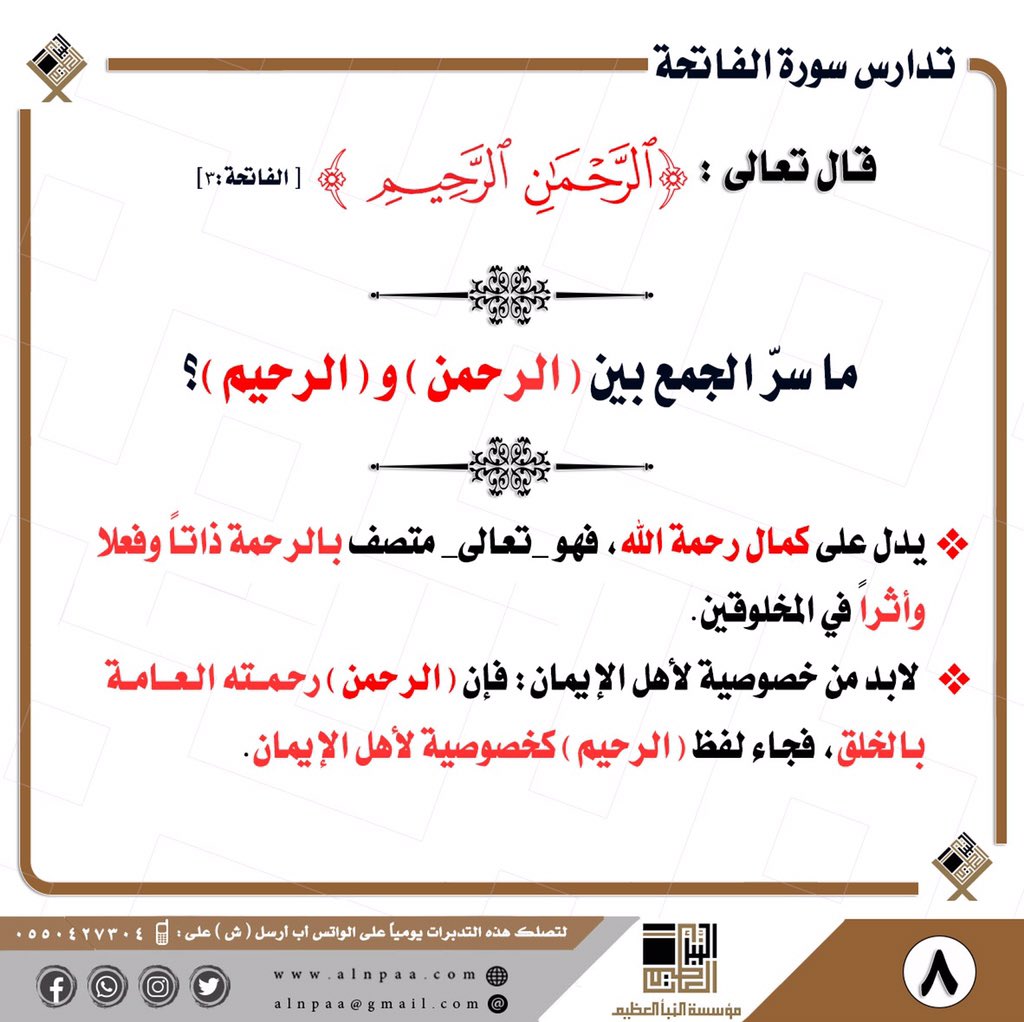 • التساؤل: قال تعالى: ﴿الرَّحْمَنِ الرَّحِيمِ﴾ ما سرّ الجمع بين (الرحمن)، و(الرحيم)؟