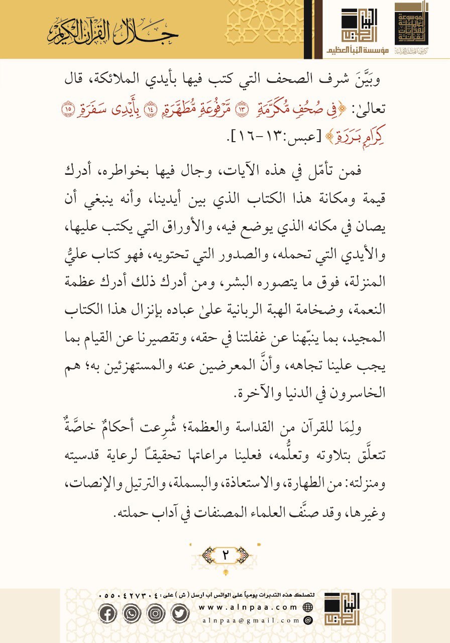فمن تأمل في هذه الآيات، وجال فيها بخواطره، أدرك قيمة ومكانة هذا الكتاب الذي بين أيدينا، وأنه ينبغي أن يصان في مكانه الذي يوضع فيه، والأوراق التي يكتب عليها، والأيدي التي تحمله، والصدور التي تحتويه، فه... المزيد