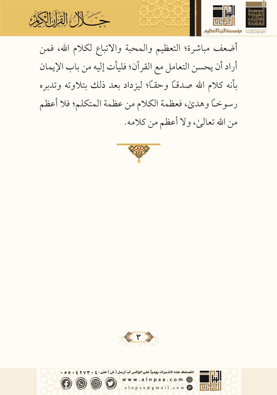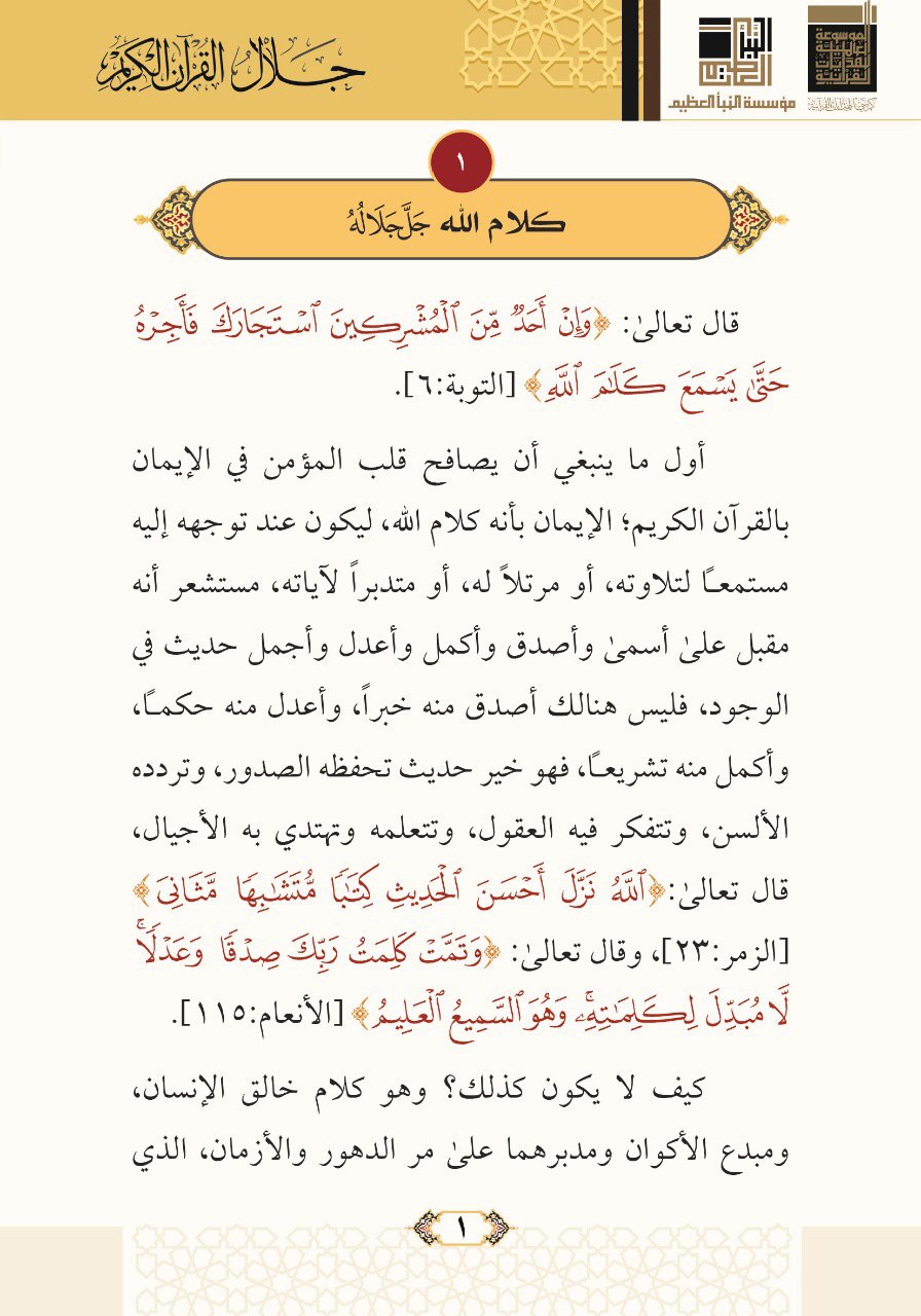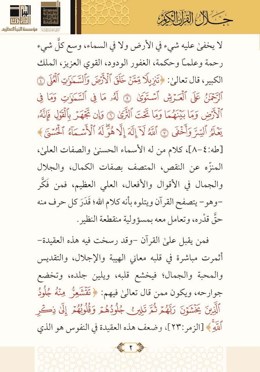 كلام من له الأسماء الحسنى والصفات العلى، المنزه عن النقص المتصف بصفات الكمال، والجلال والجمال في الأقوال والأفعال، العلي العظيم، فمن فكر - وهو - يتصفح القرآن ويتلوه بأنه كلام الله ؛ قَدَرَ كل حرف منه ... المزيد
