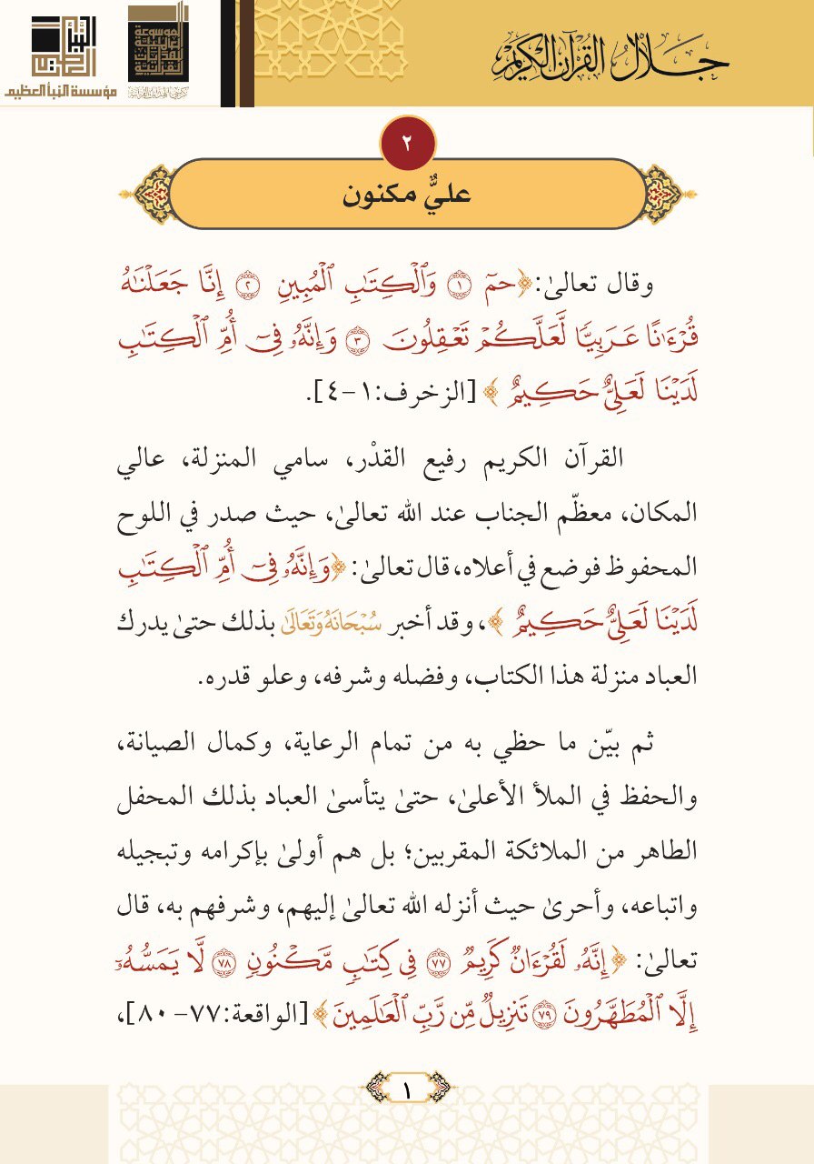 القرآن الكريم رفيع القدر، سامي المنزلة، عالي المكان معظم الجناب عند الله تعالى، حيث صدر في اللوح المحفوظ فوضع في أعلاه، قال تعالى: ﴿وَإِنَّهُ فِي أُمِّ الْكِتَابِ لَدَيْنَا لَعَلِيُّ حَكِيمُ ) ، وقد أخبر سُبْحَانَهُ وَتَعَالَى بذلك حتى يدرك العباد منزلة هذا الكتاب، وفضله وشرفه، وعلو قدره