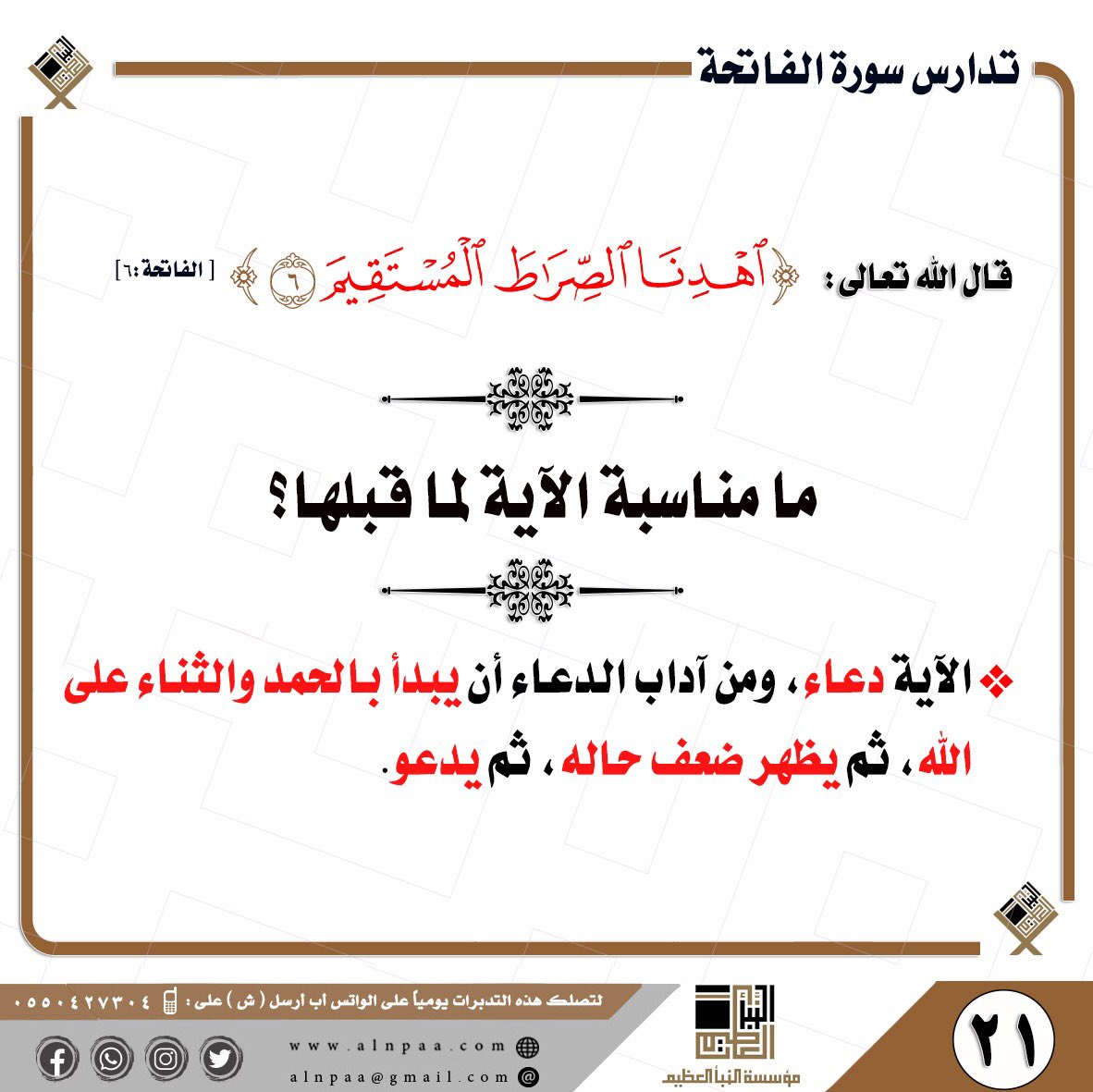 • التساؤل: ﴿اهْدِنَا الصِّرَاطَ الْمُسْتَقِيمَ﴾ ما مناسبة هذه الآية للآيات قبلها؟