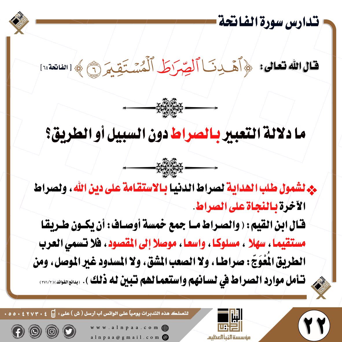 • التساؤل: ﴿اهْدِنَا الصِّرَاطَ الْمُسْتَقِيمَ﴾ ما دلالة وصف الصراط بالمستقيم؟