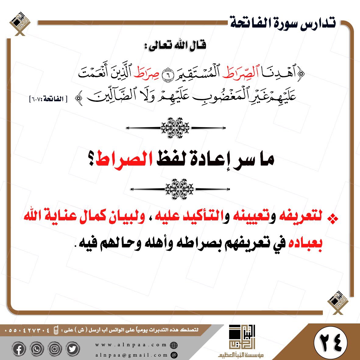 • التساؤل: قال الله تعالى: ﴿اهْدِنَا الصِّرَاطَ الْمُسْتَقِيمَ • صِرَاطَ الَّذِينَ أَنْعَمْتَ عَلَيْهِمْ غَيْرِ الْمَغْضُوبِ عَلَيْهِمْ وَلَا الضَّالِّينَ﴾ ما سر إعادة لفظ الصراط؟