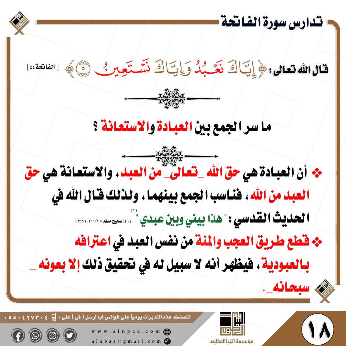 • التساؤل: قال تعالى: ﴿إِيَّاكَ نَعْبُدُ وَإِيَّاكَ نَسْتَعِينُ﴾ ما سر الجمع بين العبادة والاستعانة؟