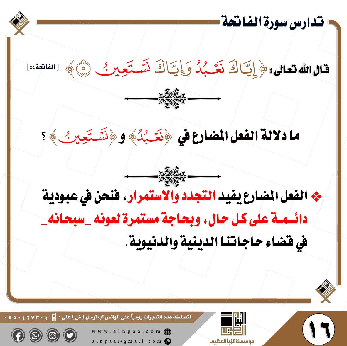 • التساؤل: قال تعالى: ﴿إِيَّاكَ نَعْبُدُ وَإِيَّاكَ نَسْتَعِينُ﴾ ما دلالة الفعل المضارع في ﴿نَعْبُدُ﴾، و﴿نَسَتَعِينُ﴾؟