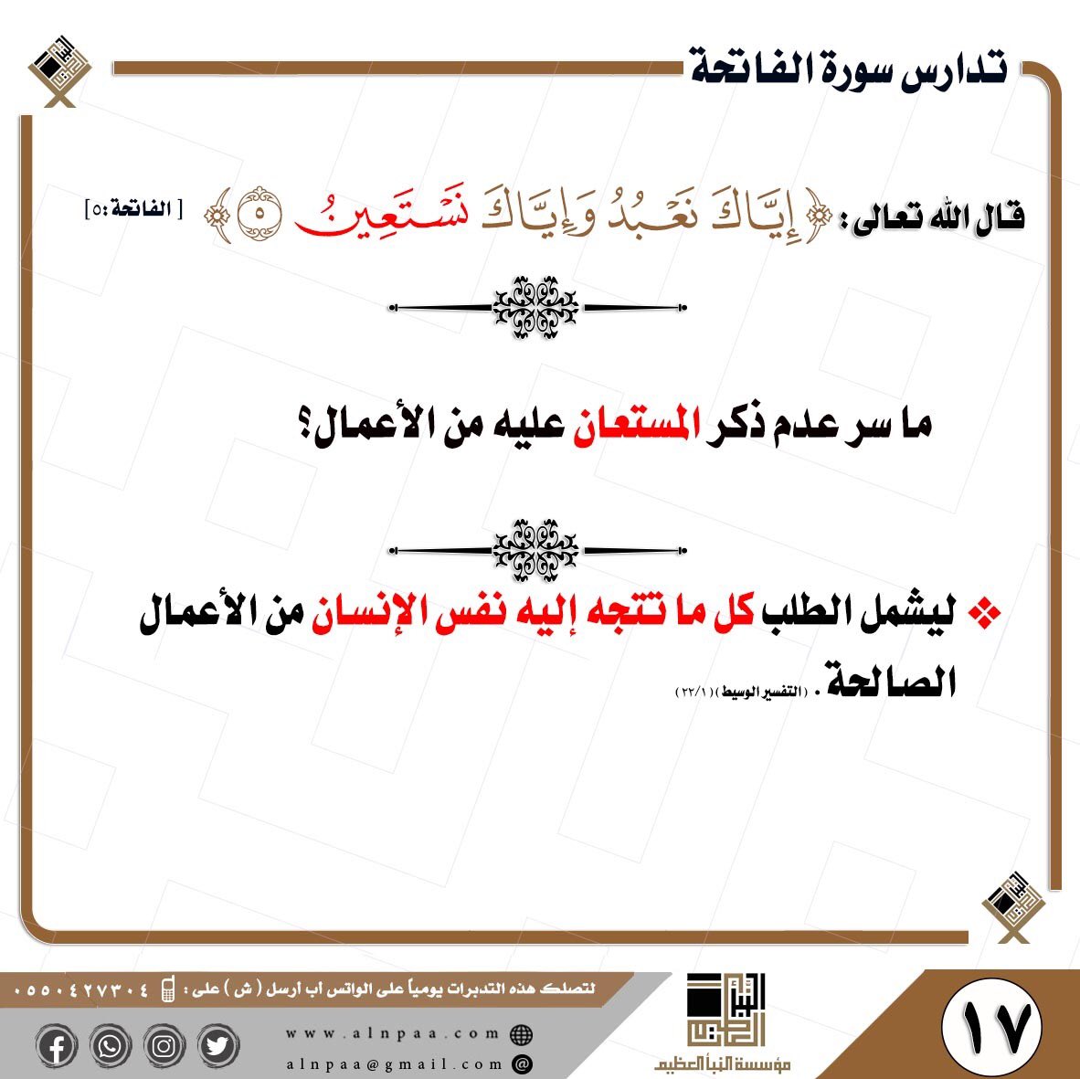 • التساؤل: قال تعالى: ﴿إِيَّاكَ نَعْبُدُ وَإِيَّاكَ نَسْتَعِينُ﴾ ما سر عدم ذكر المستعان عليه من الأعمال؟