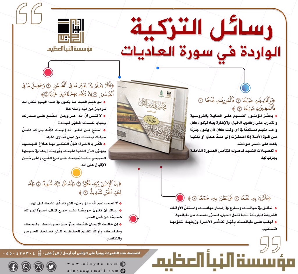 ▪️ رسائل التزكية الواردة في سورة (العاديات): ﴿إِنَّ الْإِنسَانَ لِرَبِّهِ لَكَنُودٌ • وَإِنَّهُ عَلَى ذَلِكَ لَشَهِيدٌ • وَإِنَّهُ لِحُبِّ الْخَيْرِ لَشَدِيدٌ﴾: