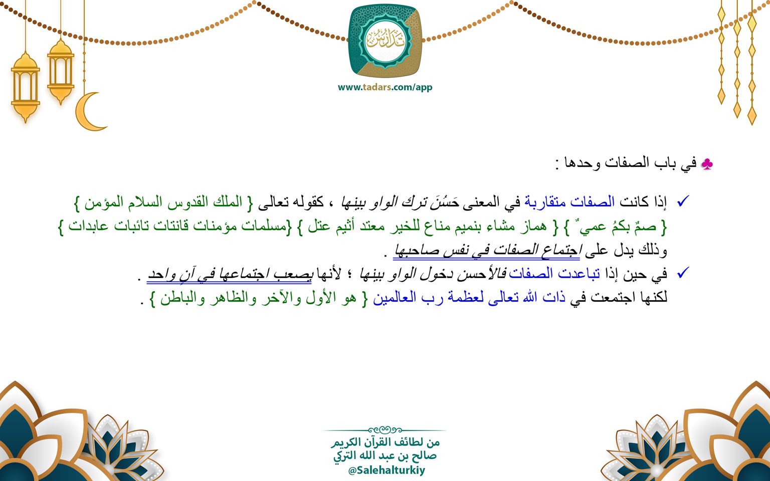 • إذا كانت الصفات متقاربة في المعنى حَسُنَ ترك الواو بينها ، كقوله تعالى { الملك القدوس السلام المؤمن }