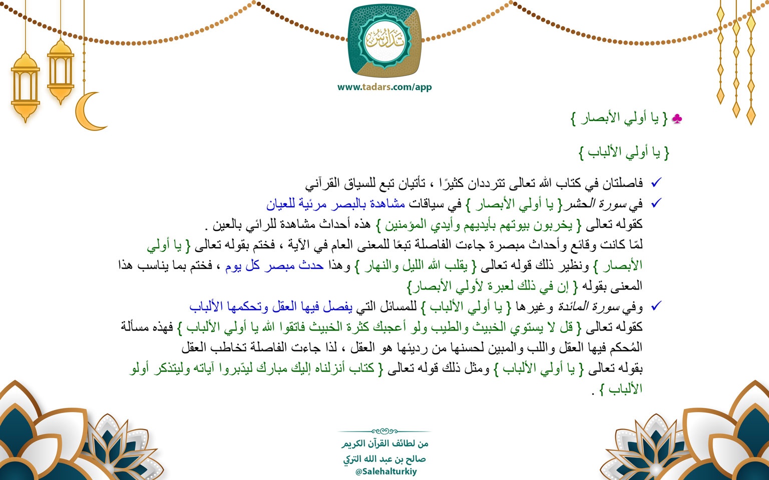 في سورة الحشر{ يا أولي الأبصار } في سياقات مشاهدة بالبصر مرئية للعيان ... المزيد