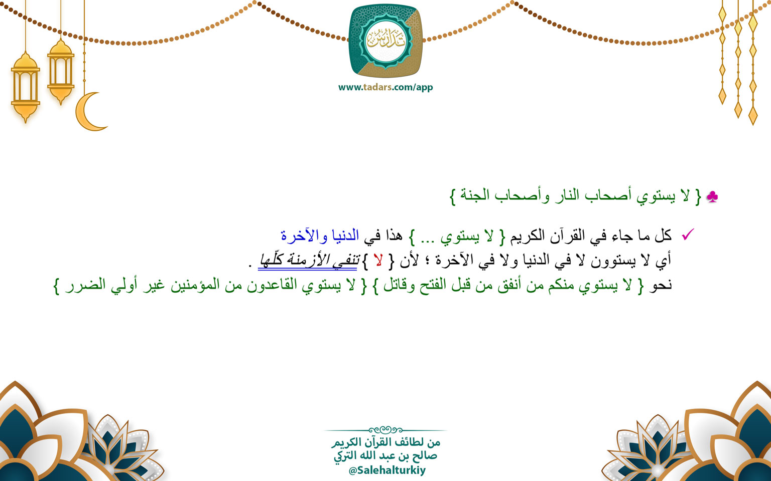 • كل ما جاء في القرآن الكريم { لا يستوي ... } هذا في الدنيا والآخرة