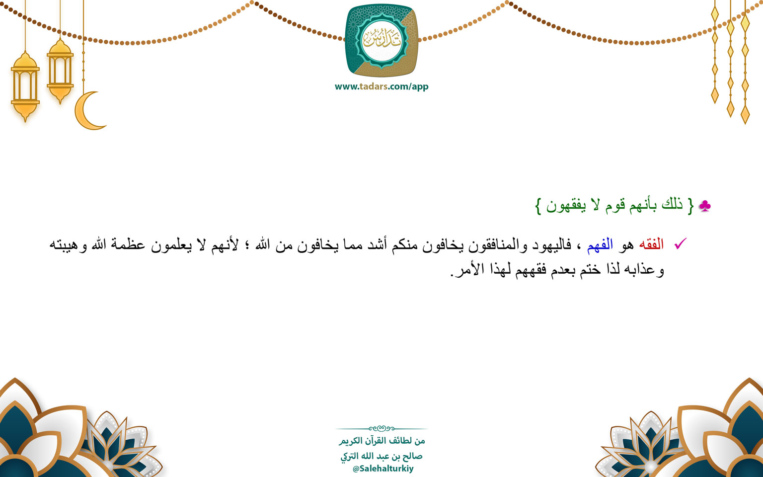 • الفقه هو الفهم ، فاليهود والمنافقون يخافون منكم أشد مما يخافون من الله ؛ لأنهم لا يعلمون عظمة الله وهيبته وعذابه لذا ختم بعدم فقههم لهذا الأمر.