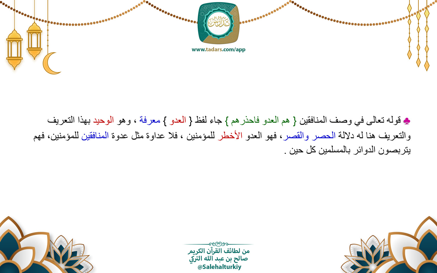 ● قوله تعالى في وصف المنافقين { هم العدو فاحذرهم } جاء لفظ { العدو } معرفة ، وهو الوحيد بهذا التعريف والتعريف هنا له دلالة الحصر والقصر، فهو العدو الأخطر للمؤمنين ، فلا عداوة مثل عدوة المنافقين للمؤمنين، فهم يتربصون الدوائر بالمسلمين كل حين .