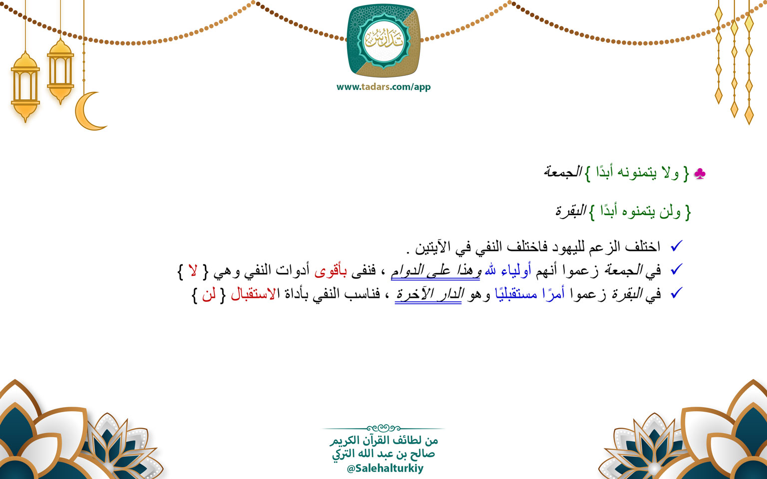 • في الجمعة زعموا أنهم أولياء لله وهذا على الدوام ، فنفى بأقوى أدوات النفي وهي { لا }