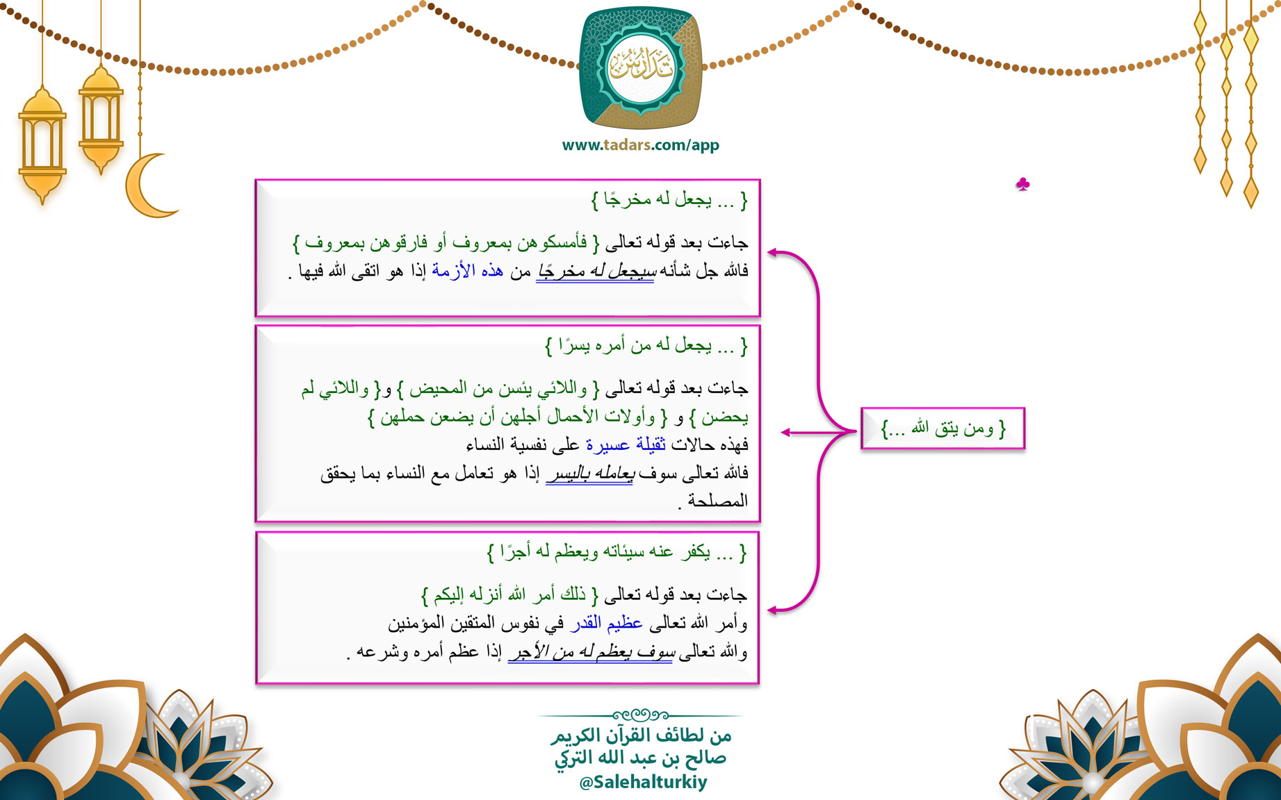 جاءت بعد قوله تعالى { فأمسكوهن بمعروف أو فارقوهن بمعروف } فالله جل شأنه سيجعل له مخرجًا من هذه... المزيد