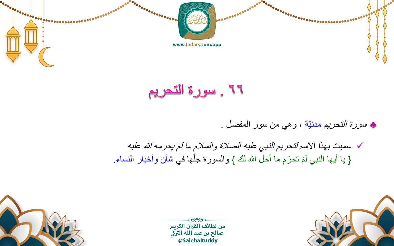 ● سورة التحريم مدنيّة ، وهي من سور المفصل .