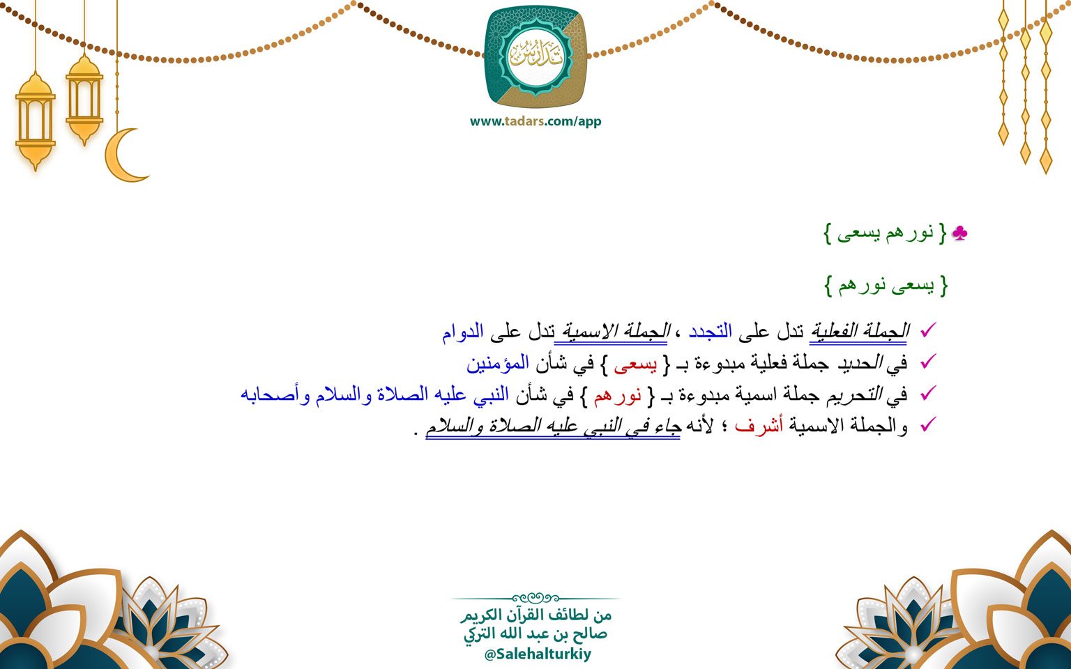 • في التحريم جملة اسمية مبدوءة بـ { نورهم... المزيد