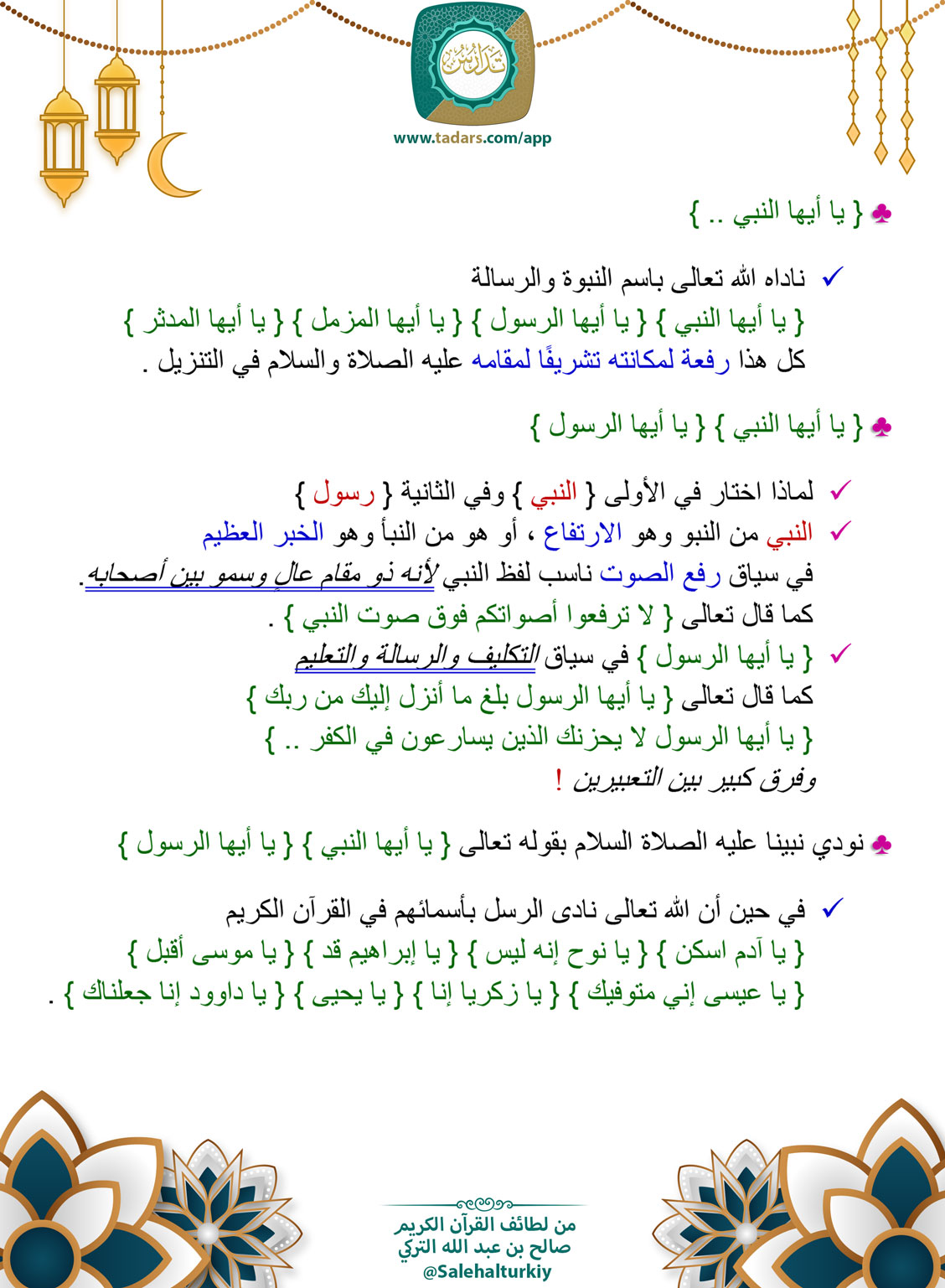{ يا أيها النبي } { يا أيها الرسول } { يا أيها المزمل } { يا أيها المدثر }