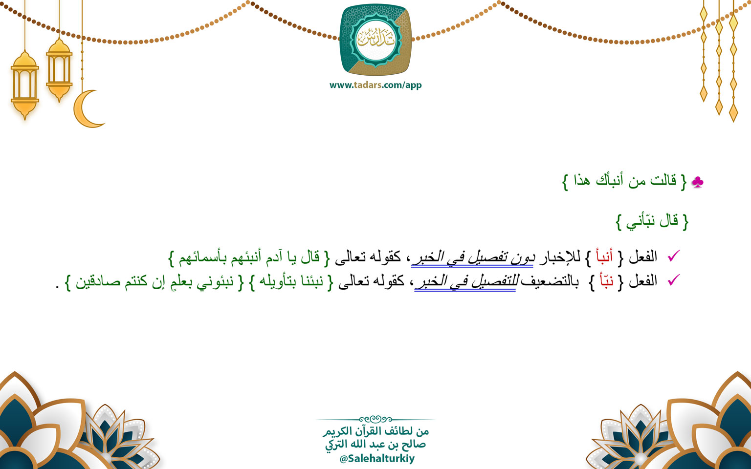 • الفعل { نبّأ } بالتضعيف للتفصيل في الخبر، كقوله تعالى { نبئنا بتأويله } { نبئوني بعلمٍ إن كنتم صادقين } .
