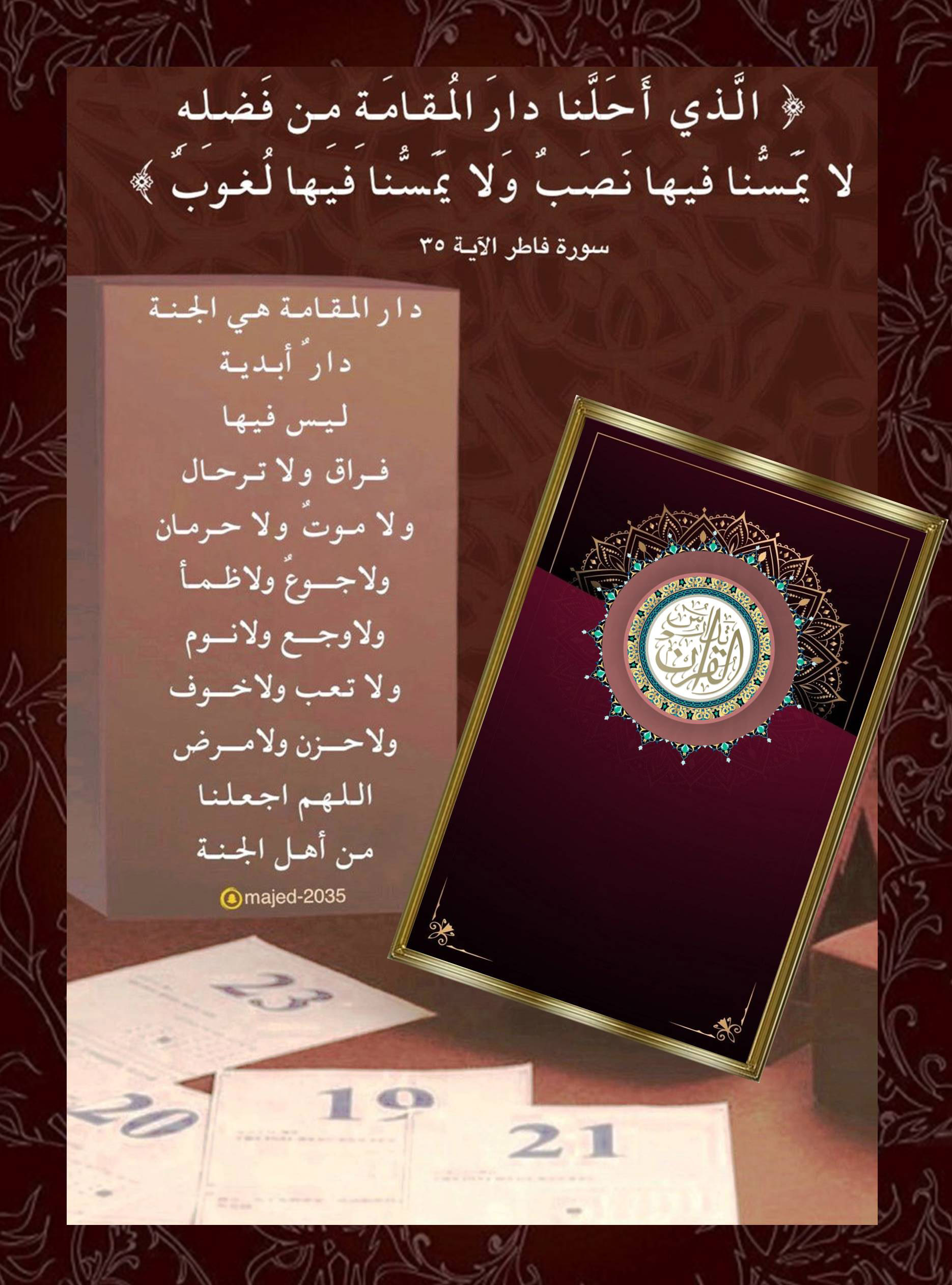 ﴿ الَّذِي أَحَلَّنَا دَارَ الْمُقَامَةِ مِن فَضْلِهِ لَا يَمَسُّنَا فِيهَا نَصَبٌ وَلَا يَمَسُّنَا فِيهَا لُغُوبٌ ﴿٣٥﴾ ﴾