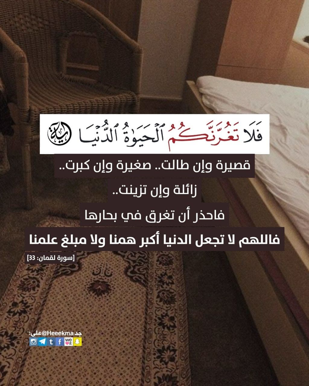 قصيرةٌ وإن طالت، صغيرةٌ وإن كبُرت، زائلةٌ وإن تزينت، فاحذر أن تغرق في بحارها .. (فاللهم لا تجعل الدنيا أكبر همِّنا ولا مبلغ علمنا).