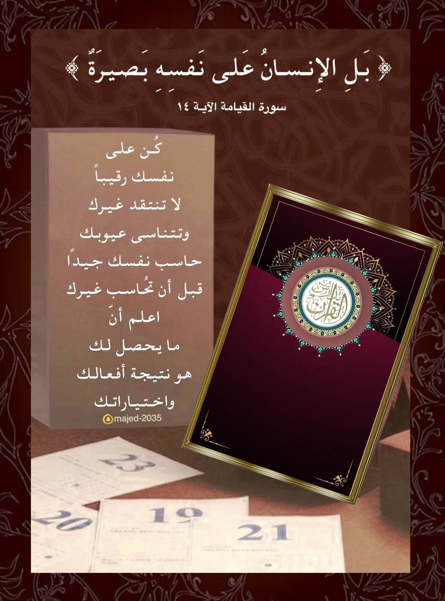 كُن على نفسك رقيباً لا تنتقد غيرك وتتناسى عيوبك، حاسب نفسك جيدًا قبل أن تحاسب غيرك، اعلم أنّ ما يحصل لك هو نتيجة أفعالك واختياراتك.