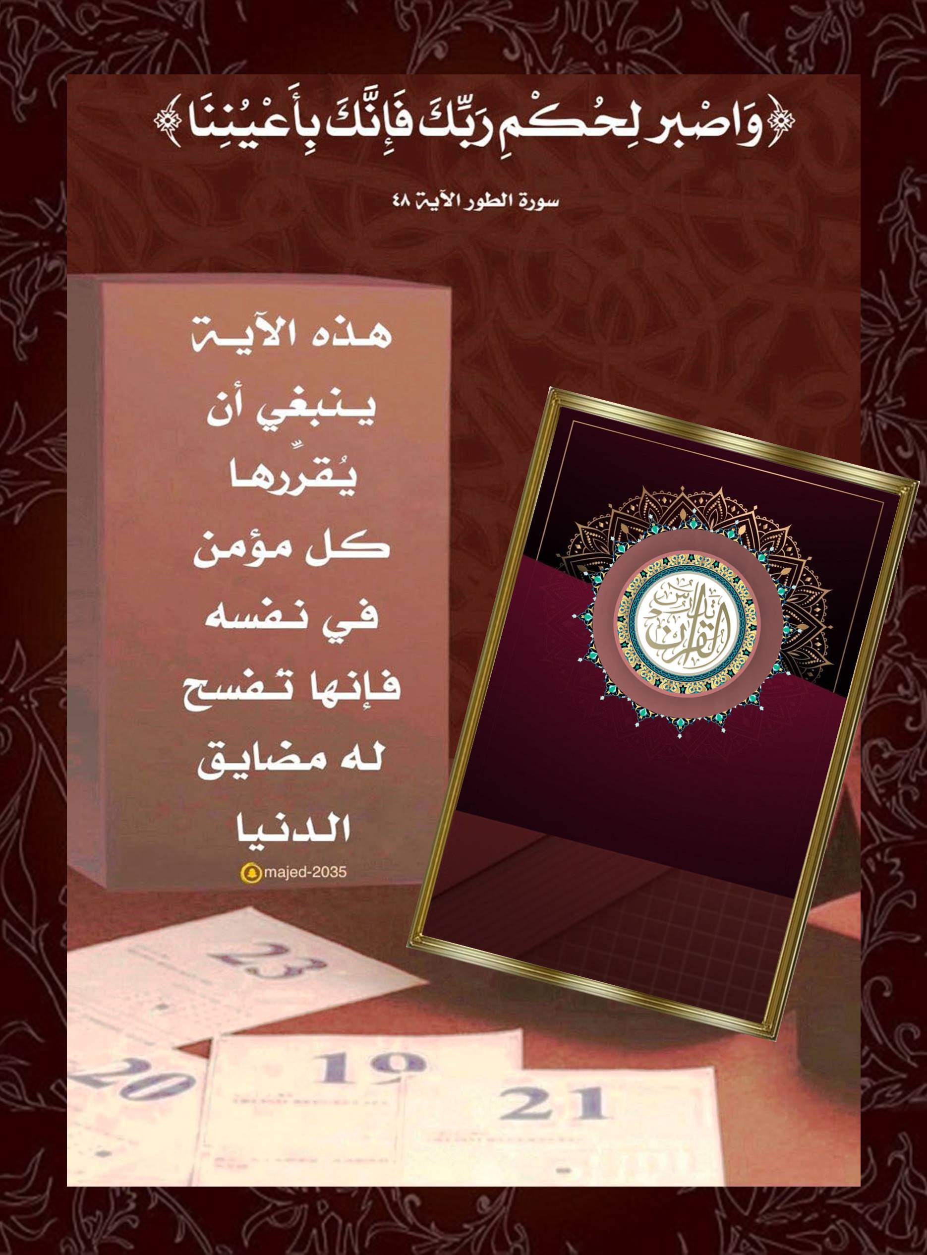 ﴿ وَاصْبِرْ لِحُكْمِ رَبِّكَ فَإِنَّكَ بِأَعْيُنِنَا وَسَبِّحْ بِحَمْدِ رَبِّكَ حِينَ تَقُومُ ﴿٤٨﴾ ﴾