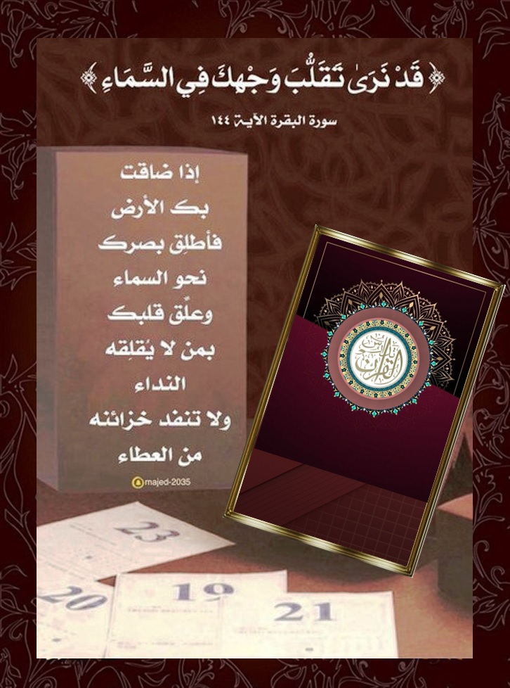 ﴿ قَدْ نَرَى تَقَلُّبَ وَجْهِكَ فِي السَّمَاءِ فَلَنُوَلِّيَنَّكَ قِبْلَةً تَرْضَاهَا فَوَلِّ وَجْهَكَ شَطْرَ الْمَسْجِدِ الْحَرَامِ وَحَيْثُ مَا كُنتُمْ فَوَلُّوا وُجُوهَكُمْ شَطْرَهُ وَإِنَّ الَّذِينَ أُوتُوا الْكِتَابَ لَيَعْلَمُونَ أَنَّهُ الْحَقُّ مِن رَّبِّهِمْ وَمَا اللَّهُ بِغَافِلٍ عَمَّا يَعْمَلُونَ ﴿١٤٤﴾ ﴾