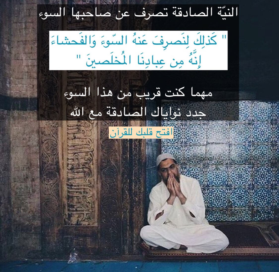 النية الصادقة تصرف عن صاحبها السوء، مهما كنت قريب من هذا السوء جدد نواياك الصادقة مع الله.