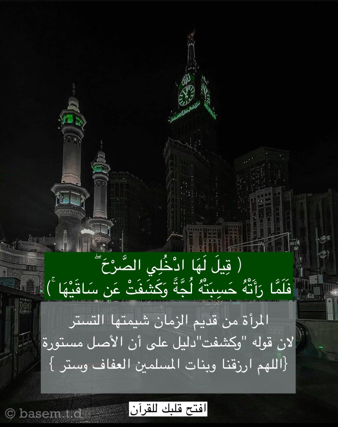 ﴿قِيلَ لَهَا ادْخُلِي الصَّرْحَ فَلَمَّا رَأَتْهُ حَسِبَتْهُ لُجَّةً وَكَشَفَتْ عَن سَاقَيْهَا﴾: