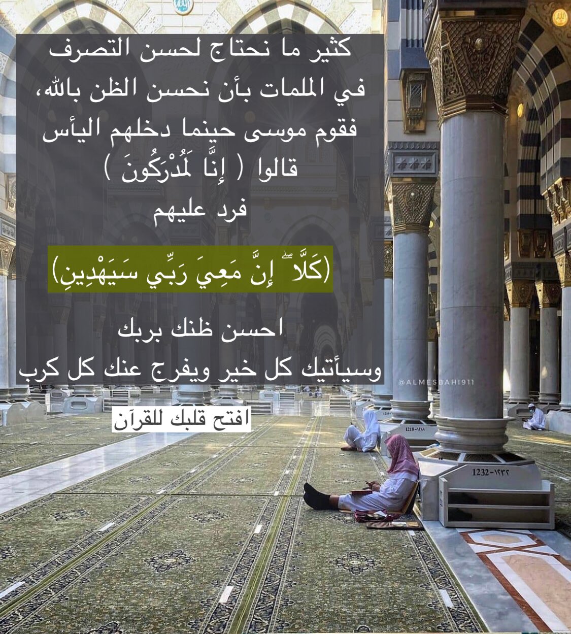 كثير ما نحتاج لحسن التصرف في الملمات بأن نحسن الظن بالله، فقوم موسى حينما دخلهم اليأس قالوا (إِنَّا لَمُدْرَكُونَ) فرد عليهم (كَلَّا ۖ إِنَّ مَعِيَ رَبِّي سَيَهْدِينِ) احسن ظنك بربك وسيأتيك كل خير ويفرج عنك كل كرب.