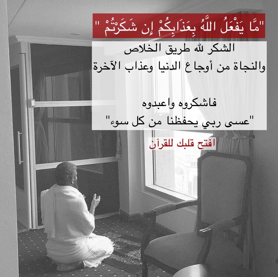 الشكر لله طريق الخلاص والنجاة من أوجاع الدنيا وعذاب الآخرة، فاشكروه واعبدوه "عسى ربي يحفظنا من كل سوء".