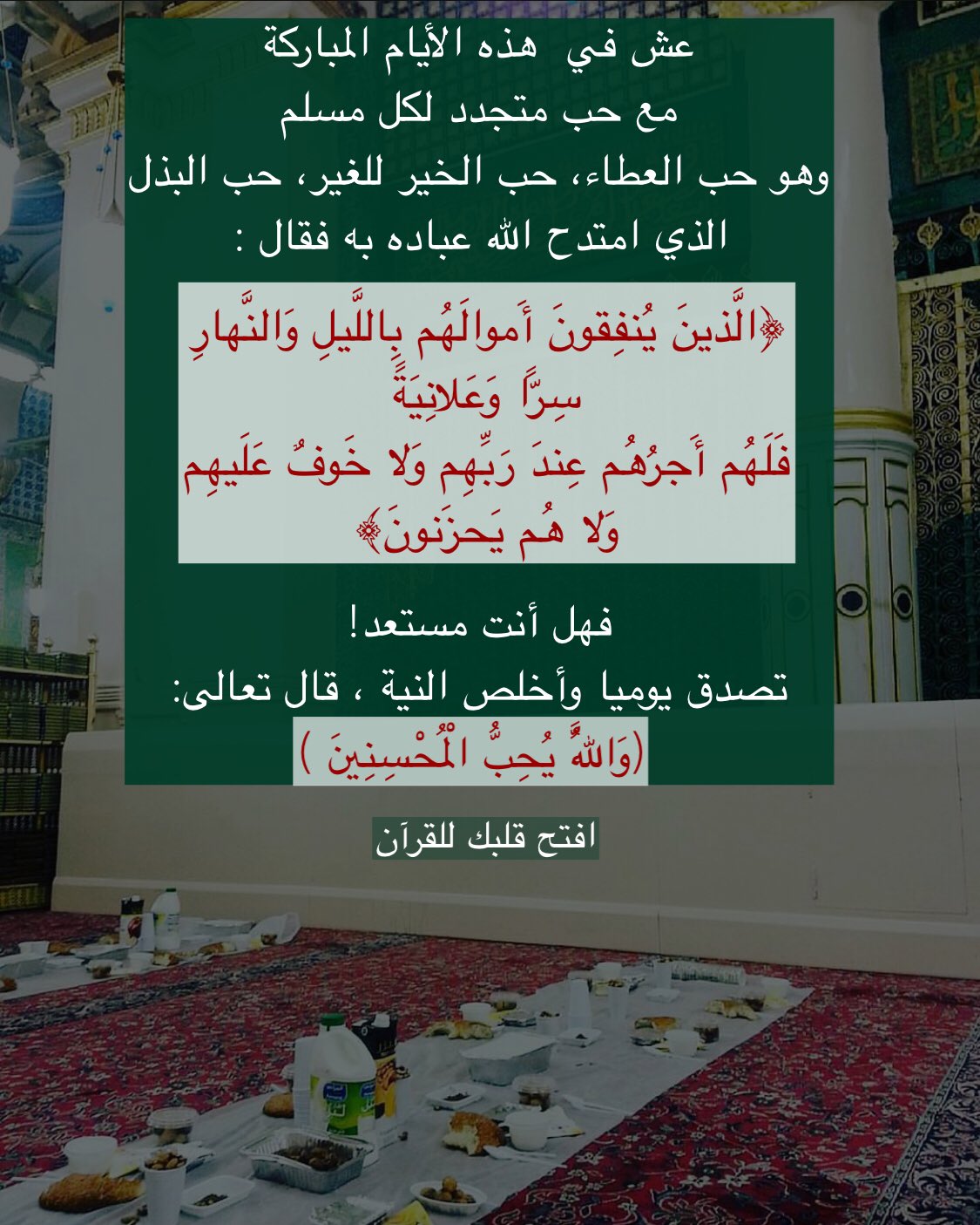 ﴿الَّذِينَ يُنفِقُونَ أَمْوَالَهُم بِاللَّيْلِ وَالنَّهَارِ سِرًّا وَعَلَانِيَةً فَلَهُمْ أَجْرُهُمْ عِندَ رَبِّهِمْ وَلَا خَوْفٌ عَلَيْهِمْ وَلَا هُمْ يَحْزَنُونَ﴾: