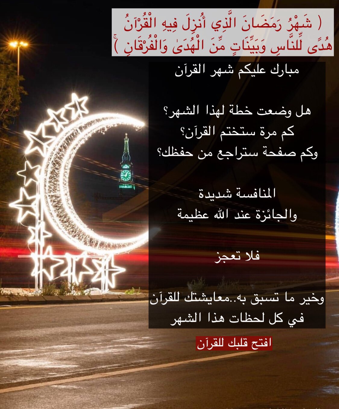 هل وضعت خطة لهذا الشهر؟ كم مرة ستختم القرآن؟ وكم صفحة ستراجع من حفظك؟ المنافسة شديدة والجائزة عند الله عظيمة .. فلا تعجز وخير ما تسبق به .. معايشتك للقرآن في كل لحظات هذا الشهر.