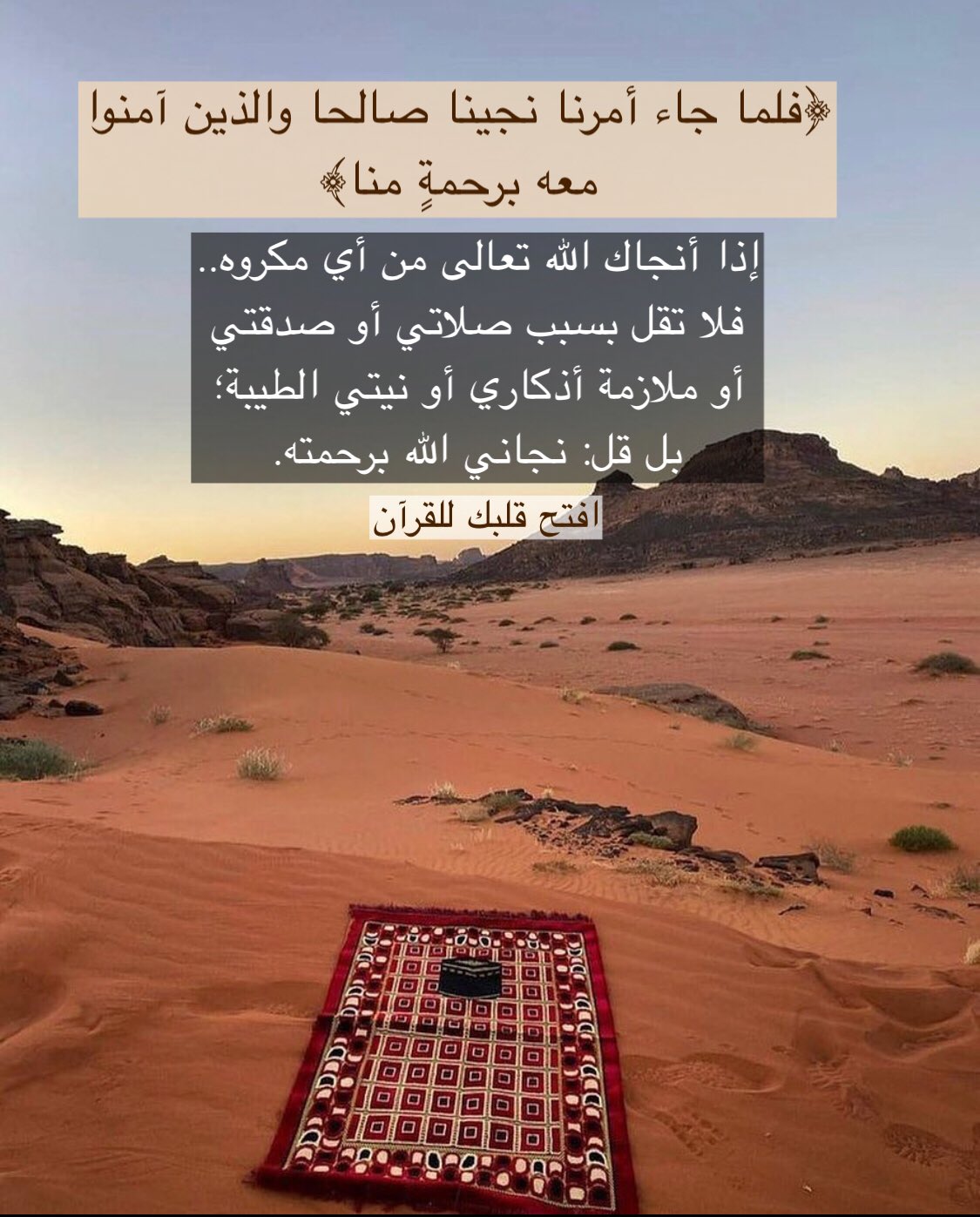 إذا أنجاك الله تعالى من أي مكروه .. فلا تقل بسبب صلاتي أو صدقتي أو ملازمة أذكاري أو نيتي الطيبة؛ بل قل: نجاني الله برحمته.