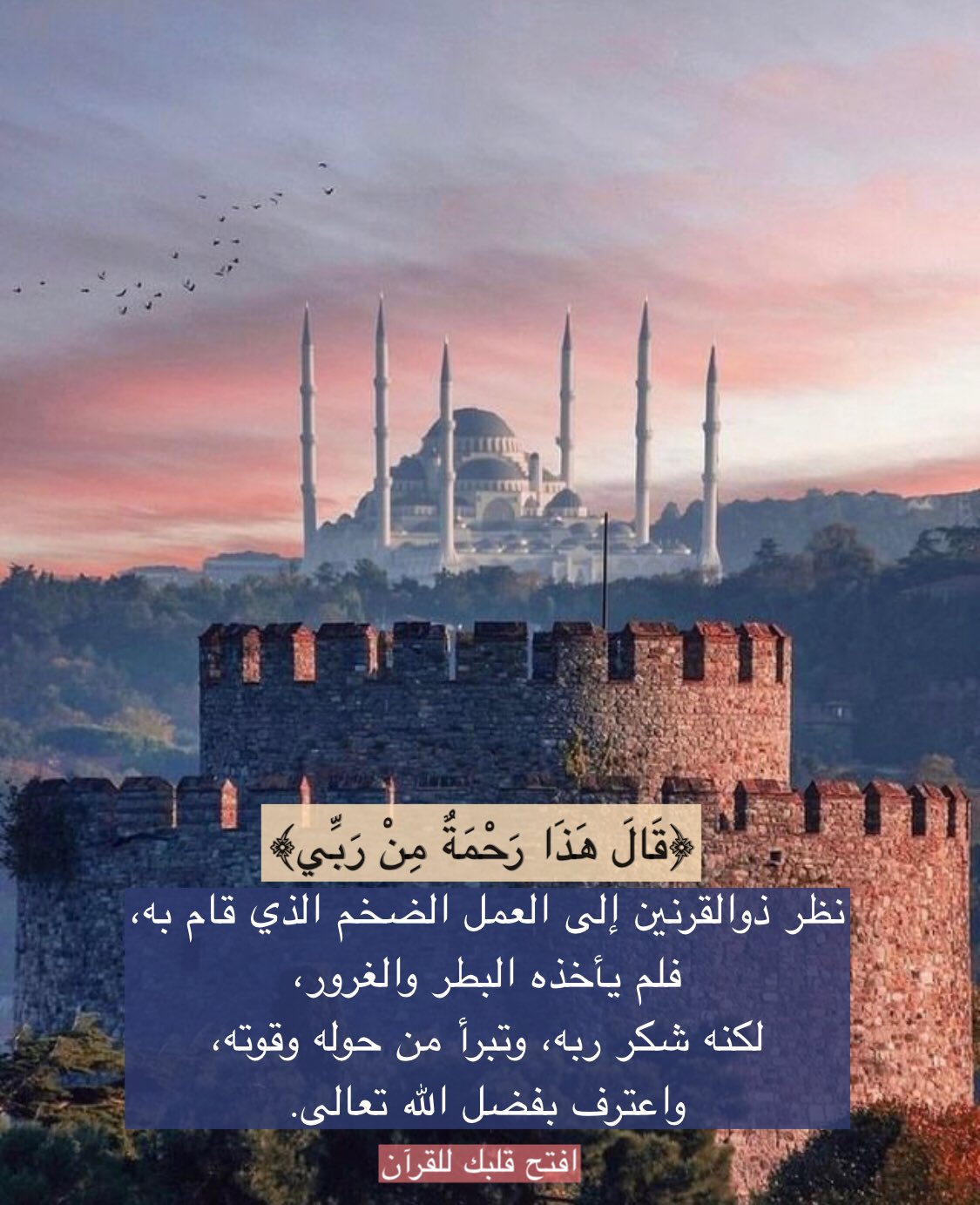 نظر ذو القرنين إلى العمل الضخم الذي قام به، فلم يأخذه البطر والغرور، لكنه شكر ربه، وتبرأ من حوله وقوته، واعترف بفضل الله تعالى.