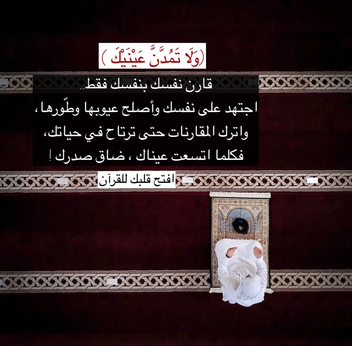 ﴿ وَلَا تَمُدَّنَّ عَيْنَيْكَ إِلَى مَا مَتَّعْنَا بِهِ أَزْوَاجًا مِّنْهُمْ زَهْرَةَ الْحَيَاةِ الدُّنْيَا لِنَفْتِنَهُمْ فِيهِ وَرِزْقُ رَبِّكَ خَيْرٌ وَأَبْقَى ﴿١٣١﴾ ﴾