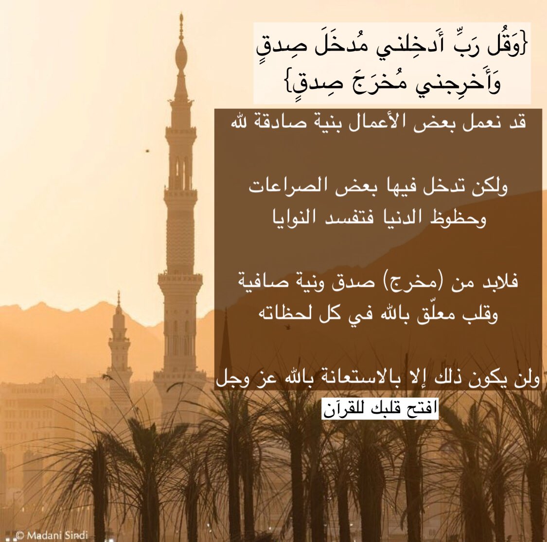 قد نعمل بعض الأعمال بنية صادقة لله ولكن تدخل فيها بعض الصراعات وحظوظ الدنيا فتفسد النوايا فلابد من (مخرج) صدق ونية صافية وقلب معلق بالله في كل لحظاته ولن يكون ذلك إلا بالاستعانة بالله عز وجل.