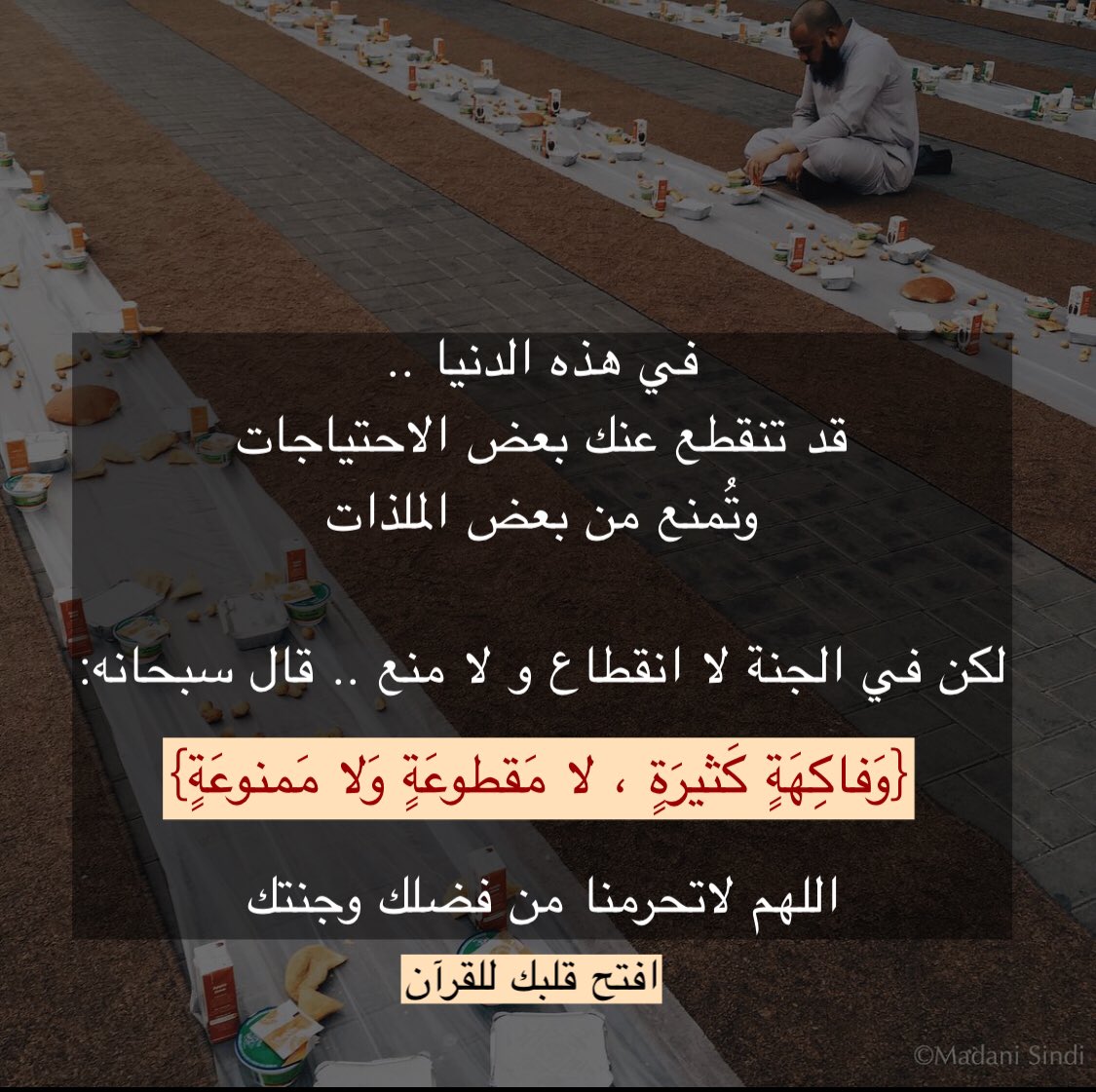 في هذه الدنيا قد تنقطع عنك بعض الاحتياجات وتُمنع من بعض الملذات لكن في الجنة لا انقطاع و لا منع .. قال سبحانه: (وَفاكِهَةٍ كَثِيرَةٍ لا مَقطوعَةٍ وَلا مَمنوعةٍ)، (اللهم لا تحرمنا من فضلك وجنتك).