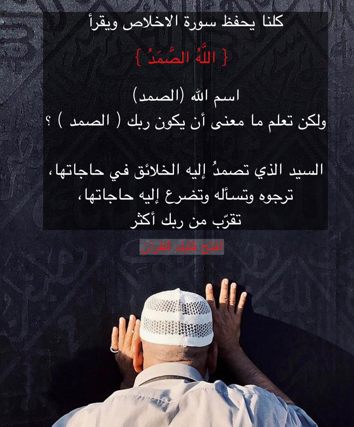 كلنا يحفظ سورة الإخلاص ويقرأ (اللَّهُ الصَّمَدُ) اسم الله (الصمد) ولكن تعلم ما معنى أن يكون ربك (الصمد)؟ السيد الذي تصمد إليه الخلائق في حاجاتها، ترجوه وتسأله وتضرع إليه حاجاتها، تقرّب من ربك أكثر.