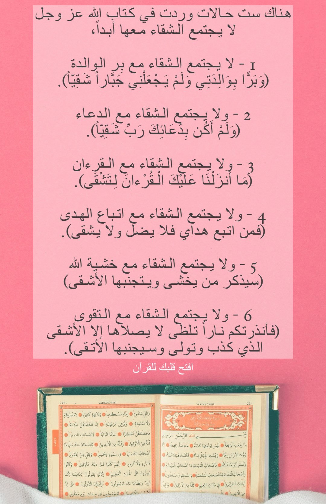 هناك ست حالات وردت في كتاب الله عز وجل لا يجتمع الشقاء معها أبداً:
