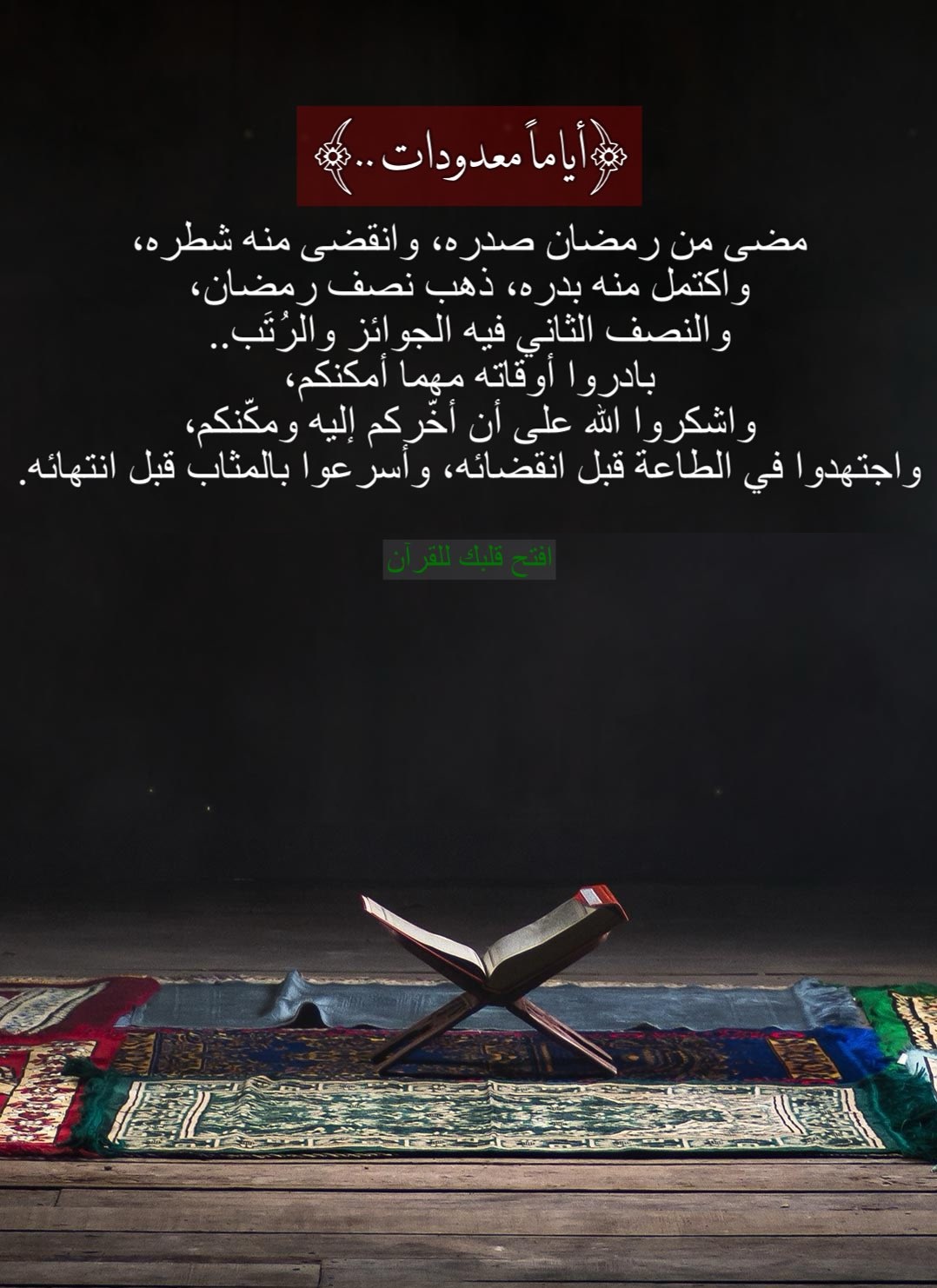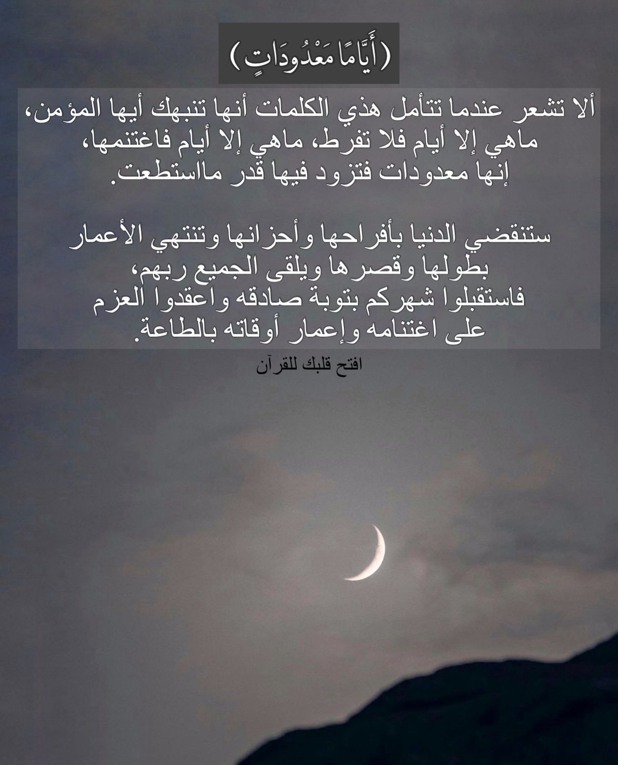 ألا تشعر عندما تتأمل هذي الكلمات أنها تنبهك أيها المؤمن، ما هي إلا أيام فلا تفرّط، ما هي إلا أيام فاغتنمها، إنها معدودات فتزود فيها قدر ما استطعت. ستنقضي الدنيا بأفراحها وأحز... المزيد