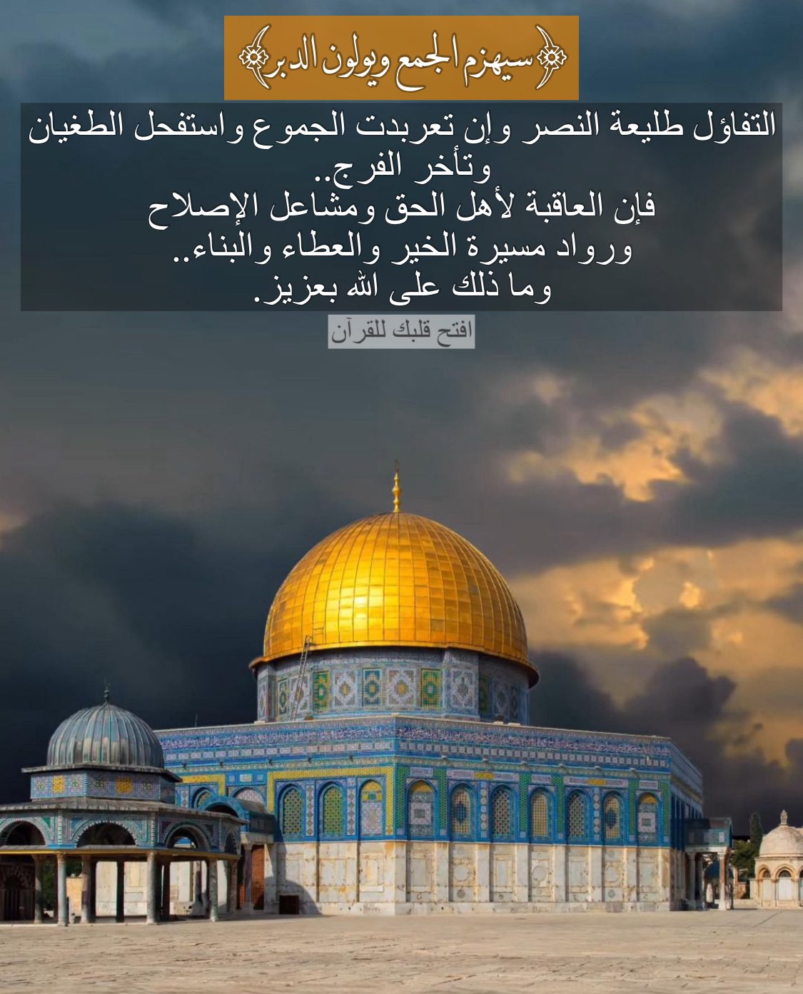 التفاؤل طليعة النصر وإن تعربدت الجموع واستفحل الطغيان وتأخر الفرج .. فإن العاقبة لأهل الحق ومشاعل الإصلاح ورواد مسيرة الخير والعطاء والبناء .. (وَمَا ذَلِكَ عَلَى اللَّهِ بِعَزِيزٍ).