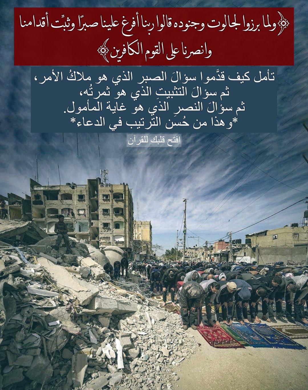 ﴿وَلَمَّا بَرَزُوا لِجَالُوتَ وَجُنُودِهِ قَالُوا رَبَّنَا أَفْرِغْ عَلَيْنَا صَبْرًا وَثَبِّتْ أَقْدَامَنَا وَانصُرْنَا عَلَى الْقَوْمِ الْكَافِرِينَ﴾